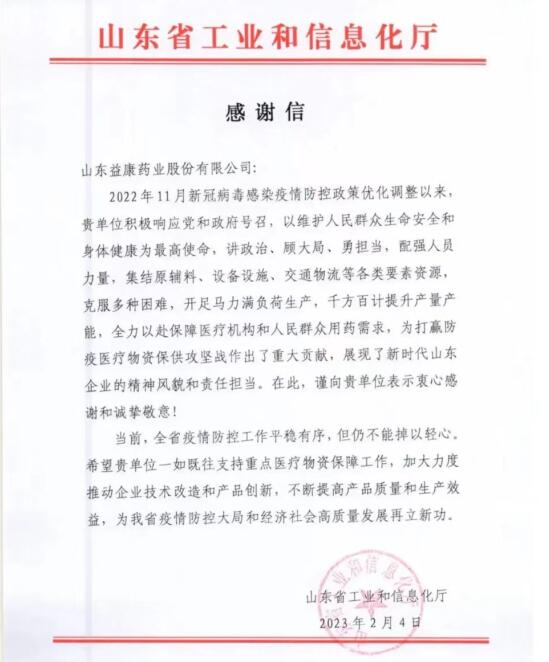 山東益康集團 > 集團新聞集團新聞公司收到山東省工信廳感謝信近日,公司收到一封來(lái)自山東省工信廳的感謝信,感謝信對山東益康藥業(yè)股份有限公司積極參與新冠病毒疫情防控工作所付出的努力和作出的貢獻,表示高度肯定和誠摯謝意!
