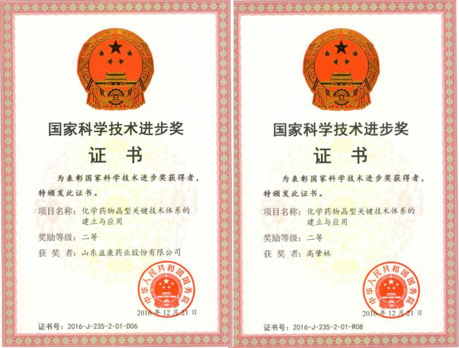 山東益康集團 > 集團新聞集團新聞益康藥業(yè)榮獲2016年度國家科學(xué)技術(shù)進(jìn)步獎1月9日,國家科學(xué)技術(shù)獎勵大會(huì )在人民大會(huì )堂隆重舉行。山東益康藥業(yè)參加研究的“化學(xué)藥物晶型關(guān)鍵技術(shù)體系的建立與應用”項目獲得2016國家科技進(jìn)步二等獎,董事長(cháng)高肇林作為項目研究人員同時(shí)獲得國家科學(xué)技術(shù)進(jìn)步二等獎。